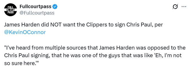 奥康纳在播客中说道:“我从多个消息源得知,詹姆斯-哈登当初就反对球队签下克里斯-保罗,他是队内少数持质疑态度的人之一,曾明确表示‘呃,我对此不是很确定’。”